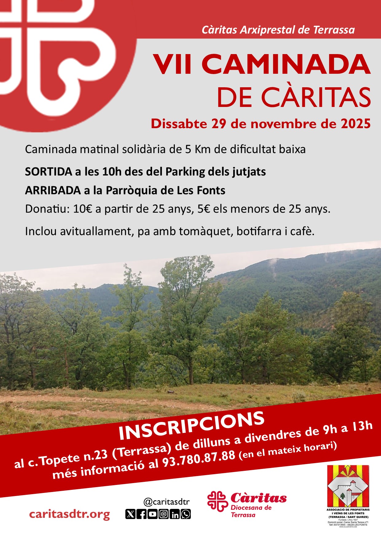 Càritas Terrassa i l’Associació de propietaris i veïns de les Fonts (Terrassa/Sant Quirze) organitzen la VII Caminada matinal solidària de 5 Km de dificultat baixa