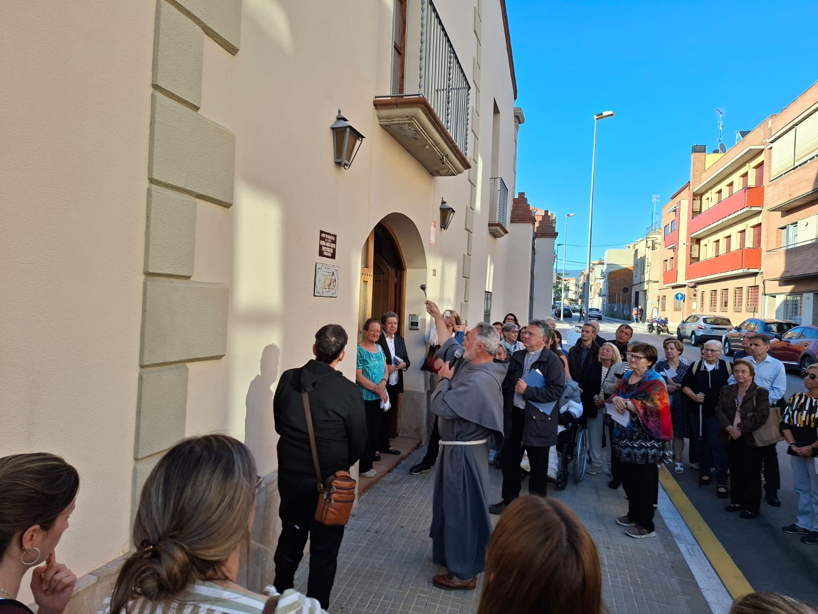 Durante el acto se realizó una oración pidiendo la intercesión de Maria Ana Mogas, presidida por Fray Ángel Mariano, el rector de la Parroquia Nuestra Señora de Montserrat y San Antonio de Padua de los Franciscanos de Granollers. A continuación, se descubrió la placa conmemorativa y Fray Ángel Mariano la bendijo para que la fundadora de la congregación interceda por todas las personas que convivan en la casa.